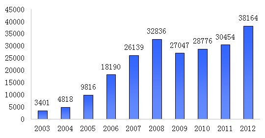 2003年至2012年之间销售业绩(单位:万元人民币)